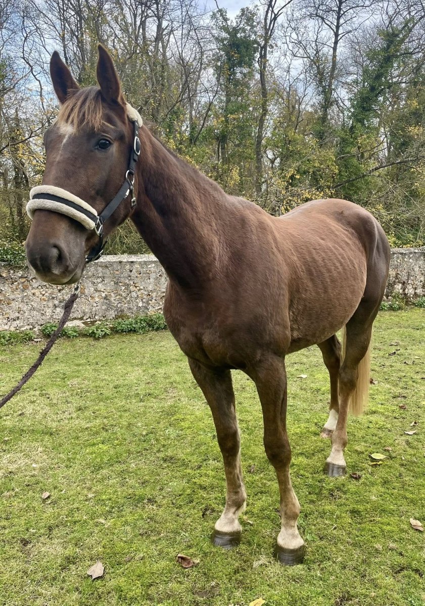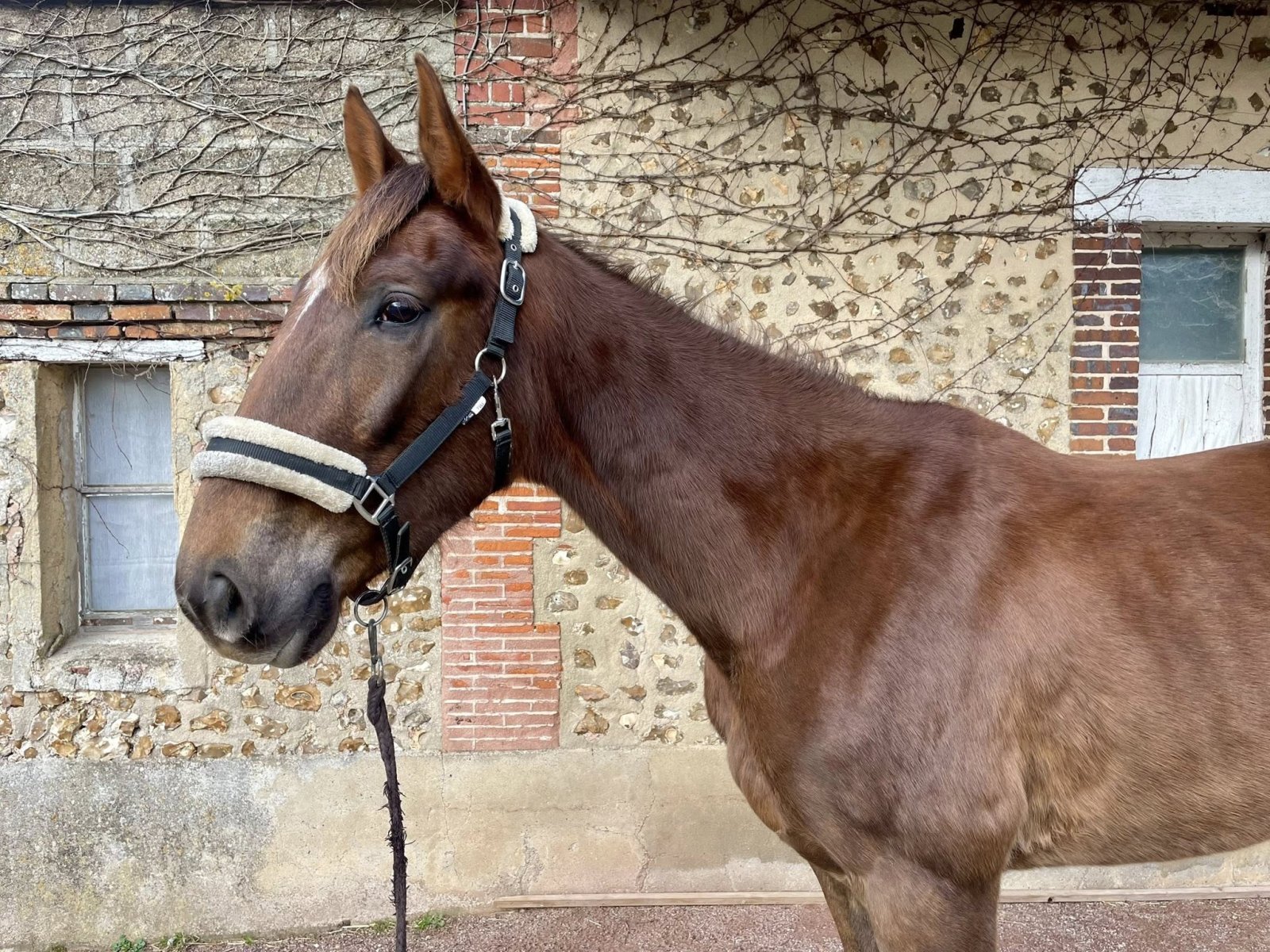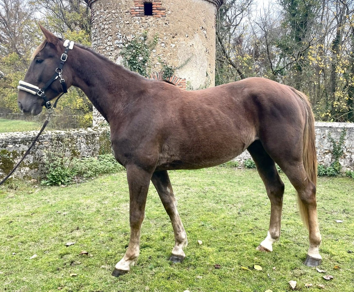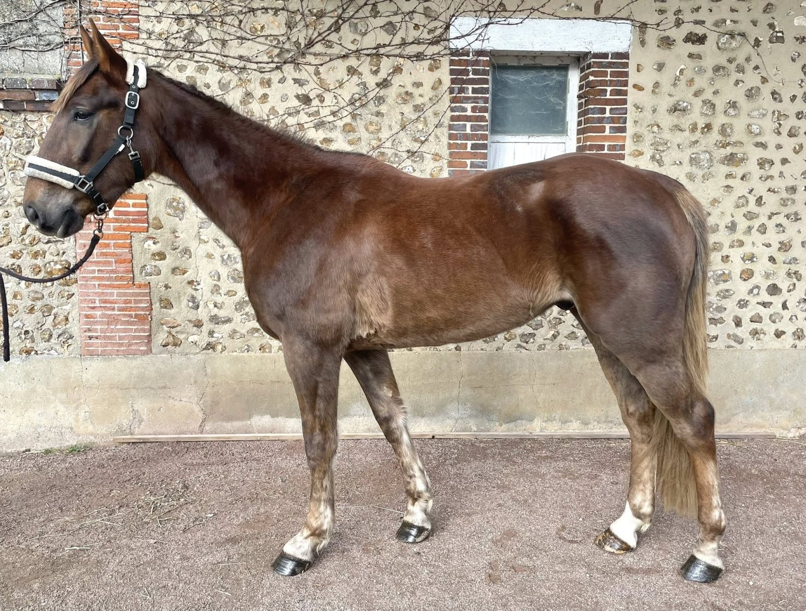 Ce beau hongre TF alezan de 4 ans toise 1m67 (fera environ 1m70).